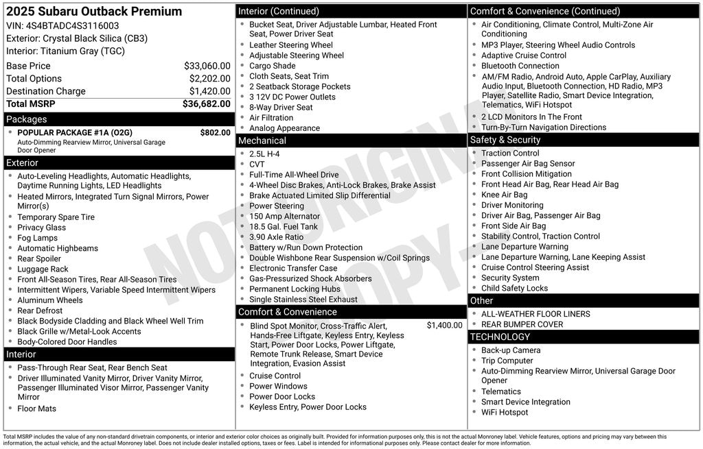 Clean CARFAX. Crystal Black Silica 2025 Subaru Outback Premium 4D Sport Utility AWD CVT Lineartronic 2.5L 4-Cylinder DOHC 16V